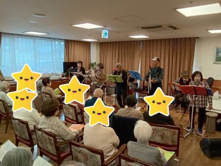 今回も楽器の音の迫力と、利用者様の大合唱で大いに盛り上がりました。