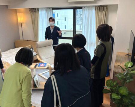 当日は、共用スペースや居室のご案内をしながら、見た目の新しさだけではなく